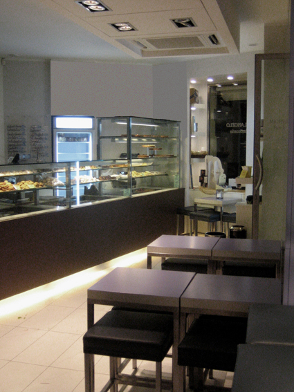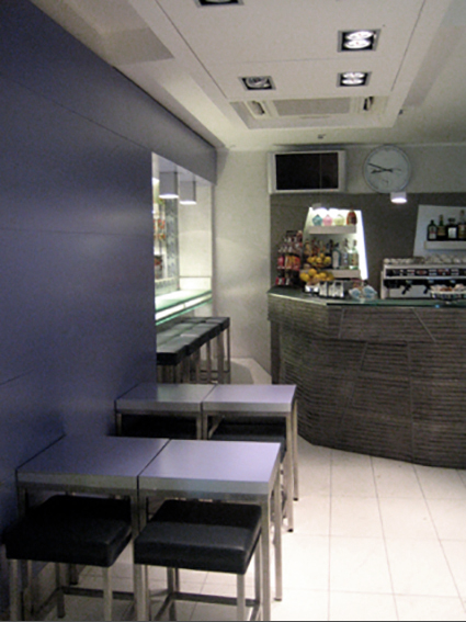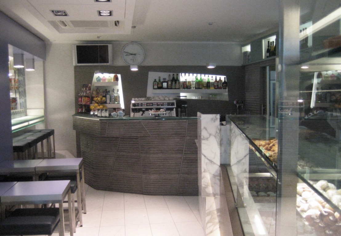 Per questo rinomato Bar Pasticceria nella zona Castelletto l’obiettivo è stato quello di garantire in uno spazio relativamente piccolo e con un linguaggio elegante e contemporaneo diverse modalità di fruizione: dal caffè frettoloso al banco, a quello sorseggiato in compagnia in una breve pausa, alla tazza di cioccolato goduta al tavolino, senza scontentare comunque l’acquirente della ampia scelta di pasticceria sapientemente esposta. Il retro banco è costituito da una scaffalatura a semi-giorno con pannelli scorrevoli in vetro artistico che catturano luce e riflessi e li riverberano all’interno del locale.